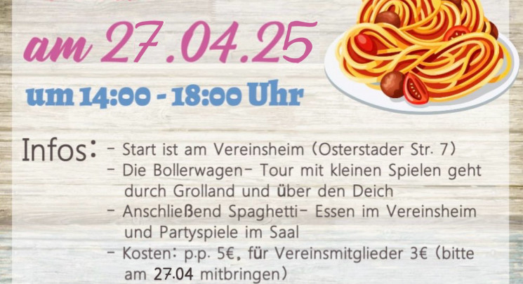 Auch in diesem Jahr laden wir euch herzlich zu unserer Kinder- Spaghetti- Tour ein! Am 27.04.25 starten wir gemeinsam mit unserem Bollerwagen am Vereinsheim. Nach der Tour erwartet euch dort ein leckeres Spaghetti-Essen sowie lustige Spiele. Wichtig: Eine Teilnahme ist nur mit vorheriger Anmeldung möglich! Wir freuen uns auf einen tollen Nachmittag…
